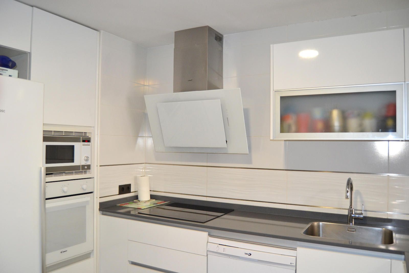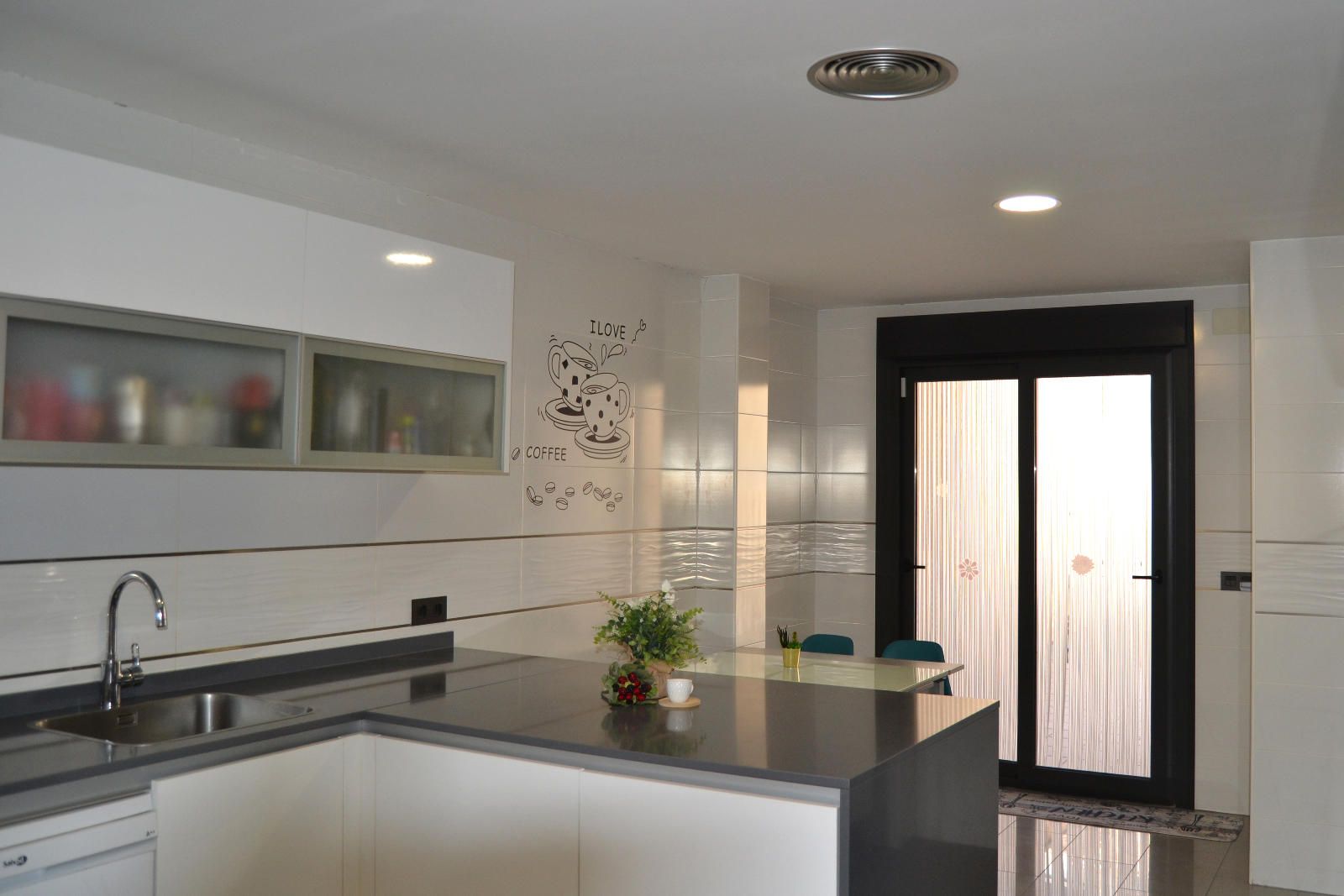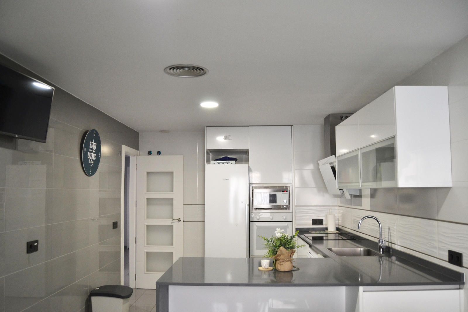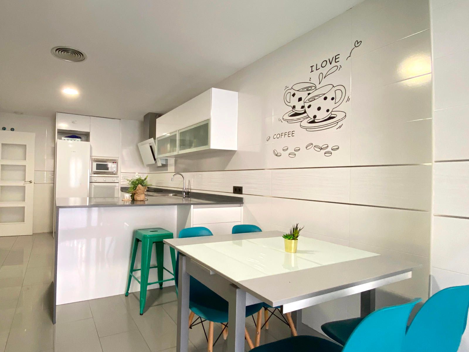 La cocina, amplia y funcional, está totalmente equipada y amueblada con diseño actual en tonos blancos, lo que potencia la luminosidad. Incluye una práctica barra americana y espacio de comedor, perfecto tanto para comidas rápidas como para reuniones más informales. Un detalle decorativo en la pared, con motivos cafeteros, añade un toque original y acogedor.