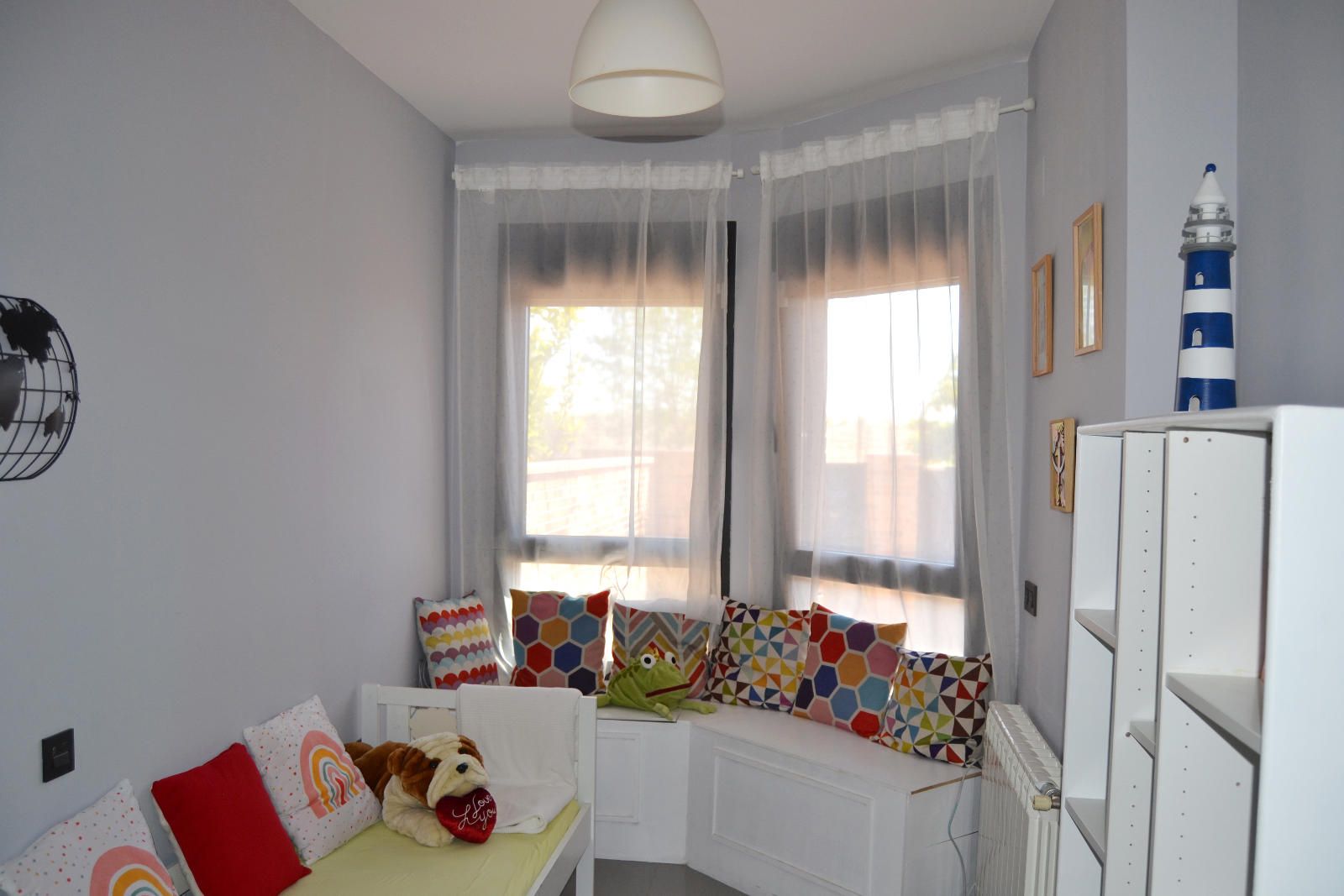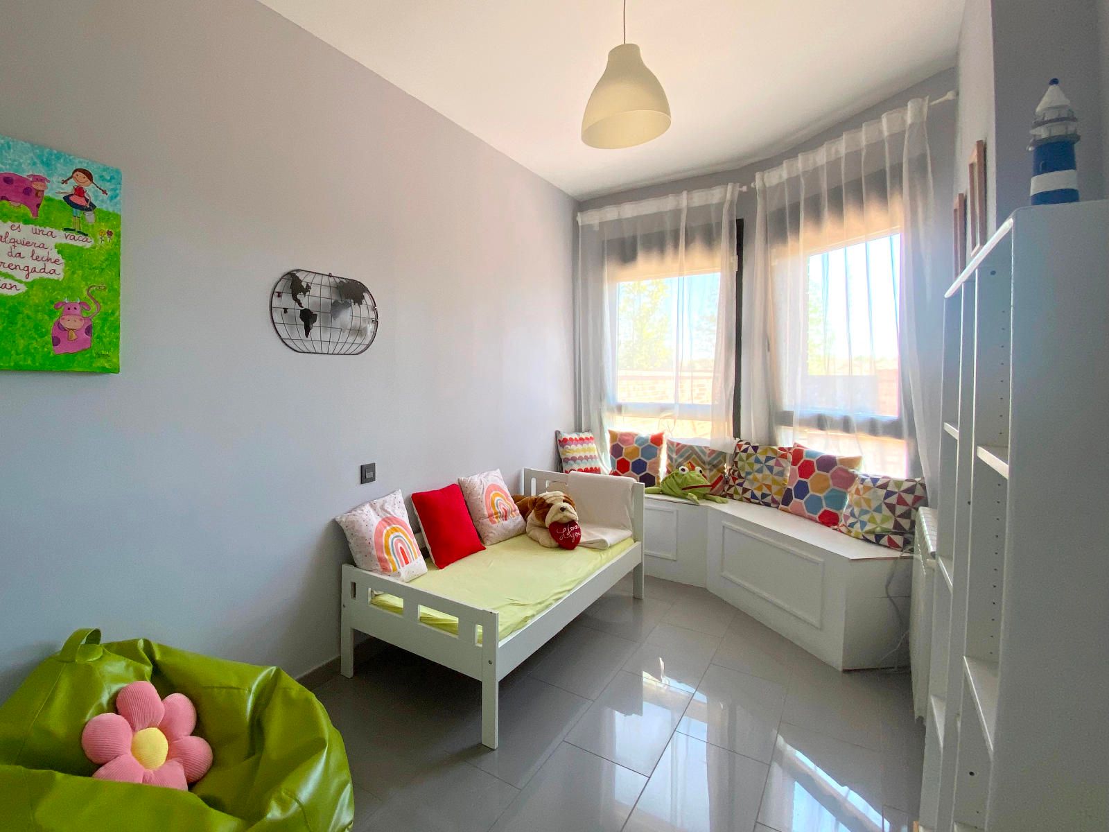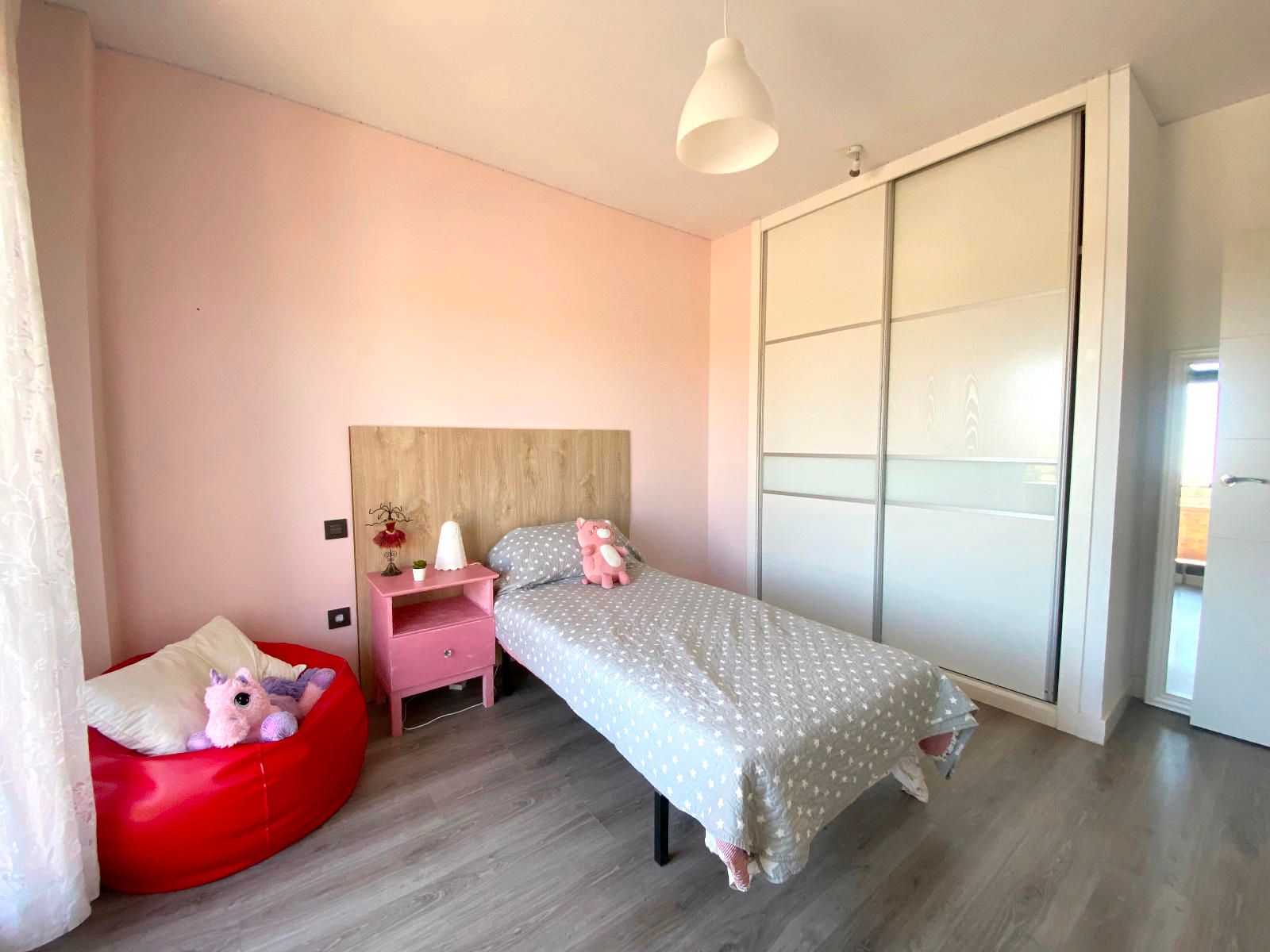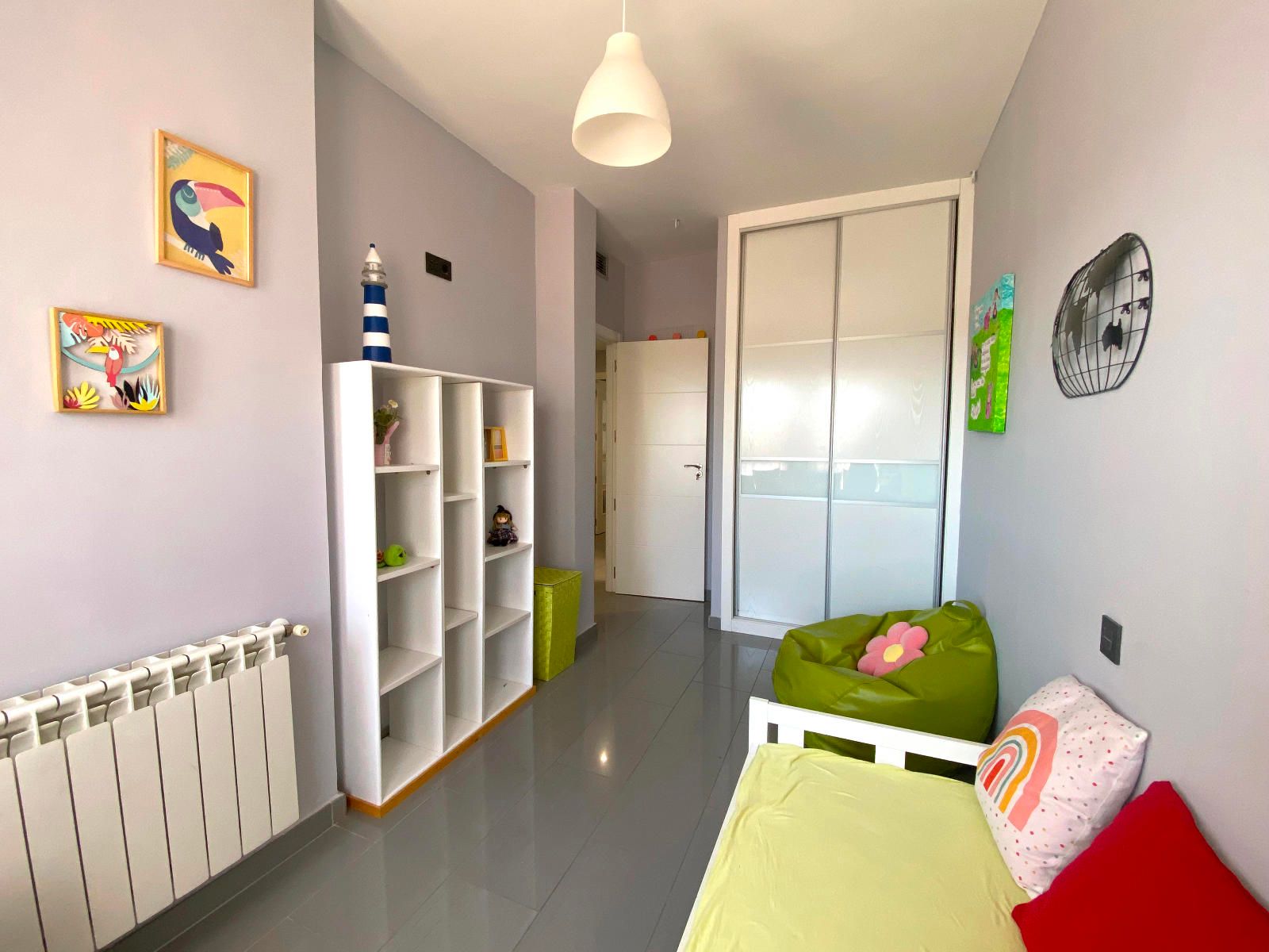 Otro de los dormitorios también cuenta con terraza, lo que lo convierte en un espacio flexible que puede destinarse tanto a habitación como a despacho o sala personal. Las habitaciones infantiles y juveniles están decoradas con cariño, con colores suaves y mobiliario actual.
