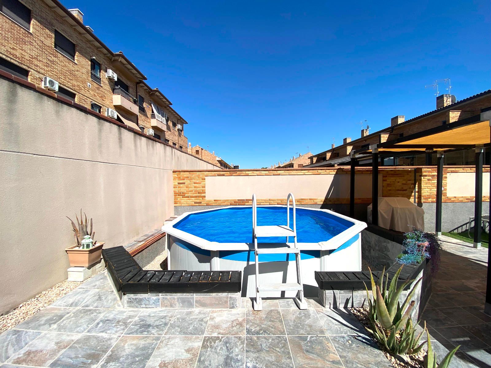 En la parte exterior, la vivienda dispone de una parcela privada con piscina elevada, césped artificial y pérgola con zona de comedor. Es un espacio pensado para aprovechar los días soleados, organizar barbacoas o simplemente descansar al aire libre.