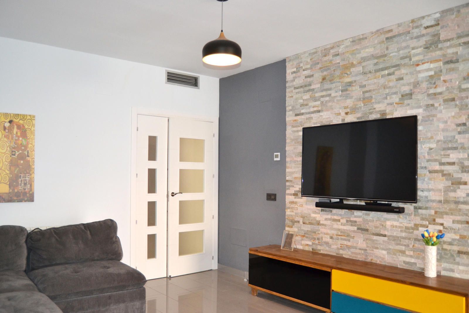 Nada más acceder a la vivienda, encontramos un ambiente moderno y luminoso. El salón principal, de gran tamaño, combina la amplitud con un estilo elegante, destacando la pared revestida en piedra que aporta personalidad al espacio. La zona de estar, ideal para disfrutar de momentos en familia o con invitados.