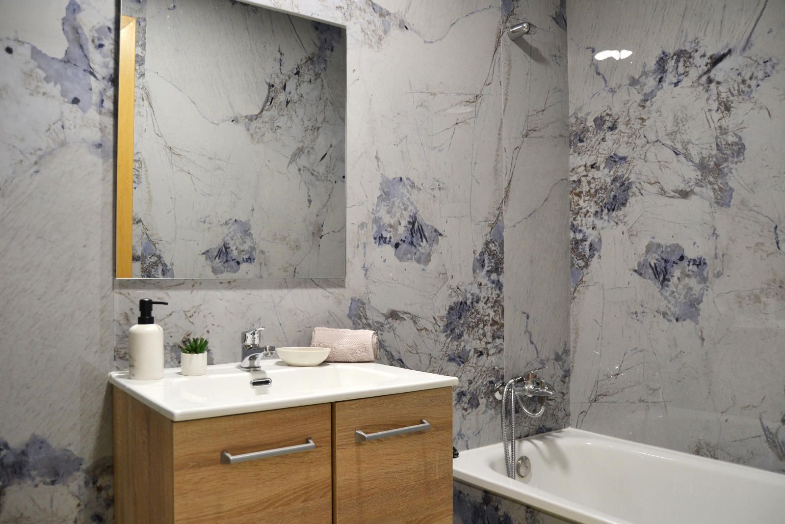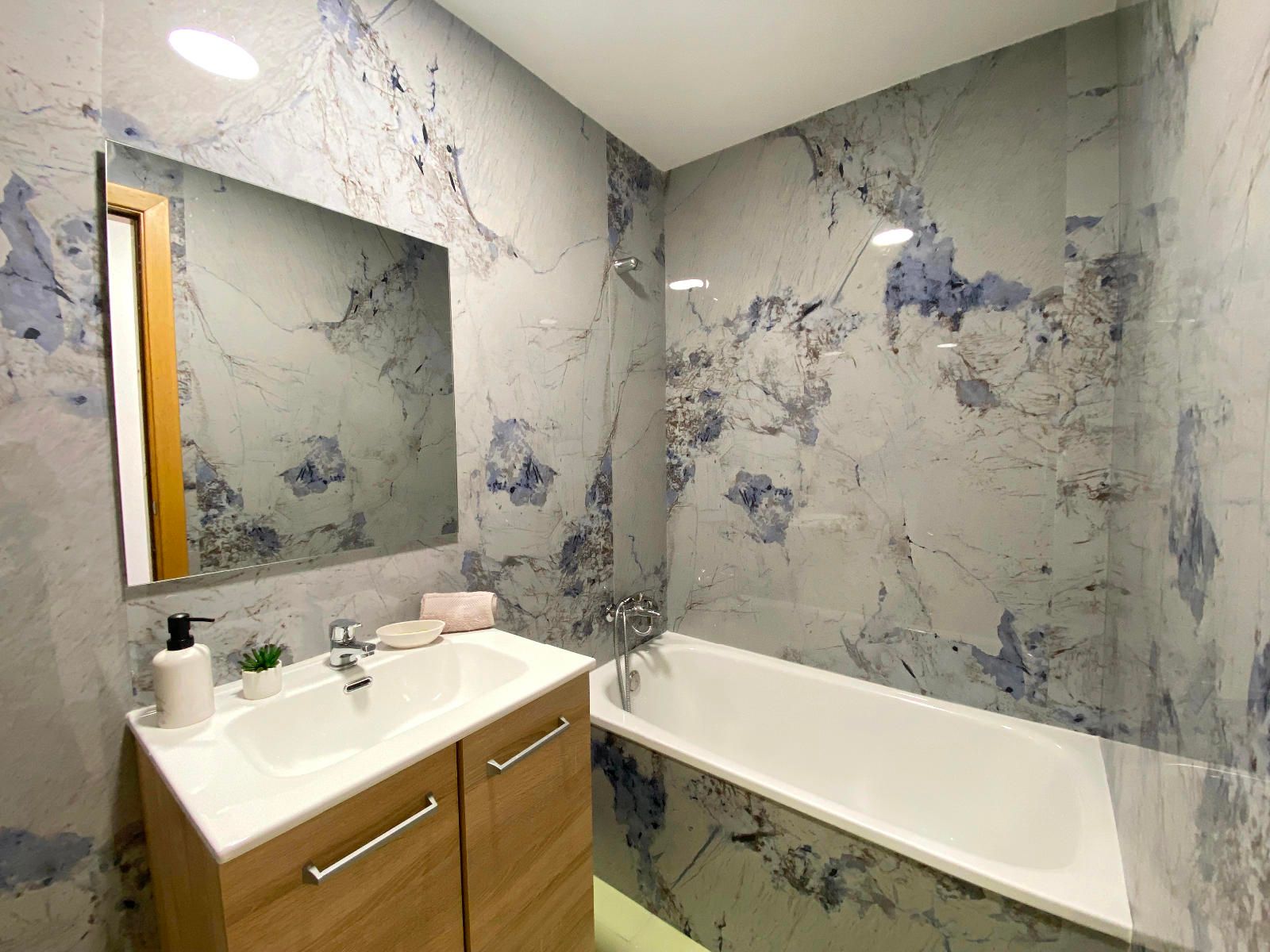 El baño es un verdadero deleite visual, con un diseño que evoca lujo y modernidad. Los revestimientos de las paredes, en un elegante mármol con vetas azules y grises, son el punto focal del espacio, creando una atmósfera de spa. Incluye una bañera con ducha incorporada y un lavabo sobre mueble de madera, que aporta calidez al conjunto. Un gran espejo sobre el lavabo amplía visualmente el espacio, haciendo de este baño un lugar ideal para relajarse y desconectar.