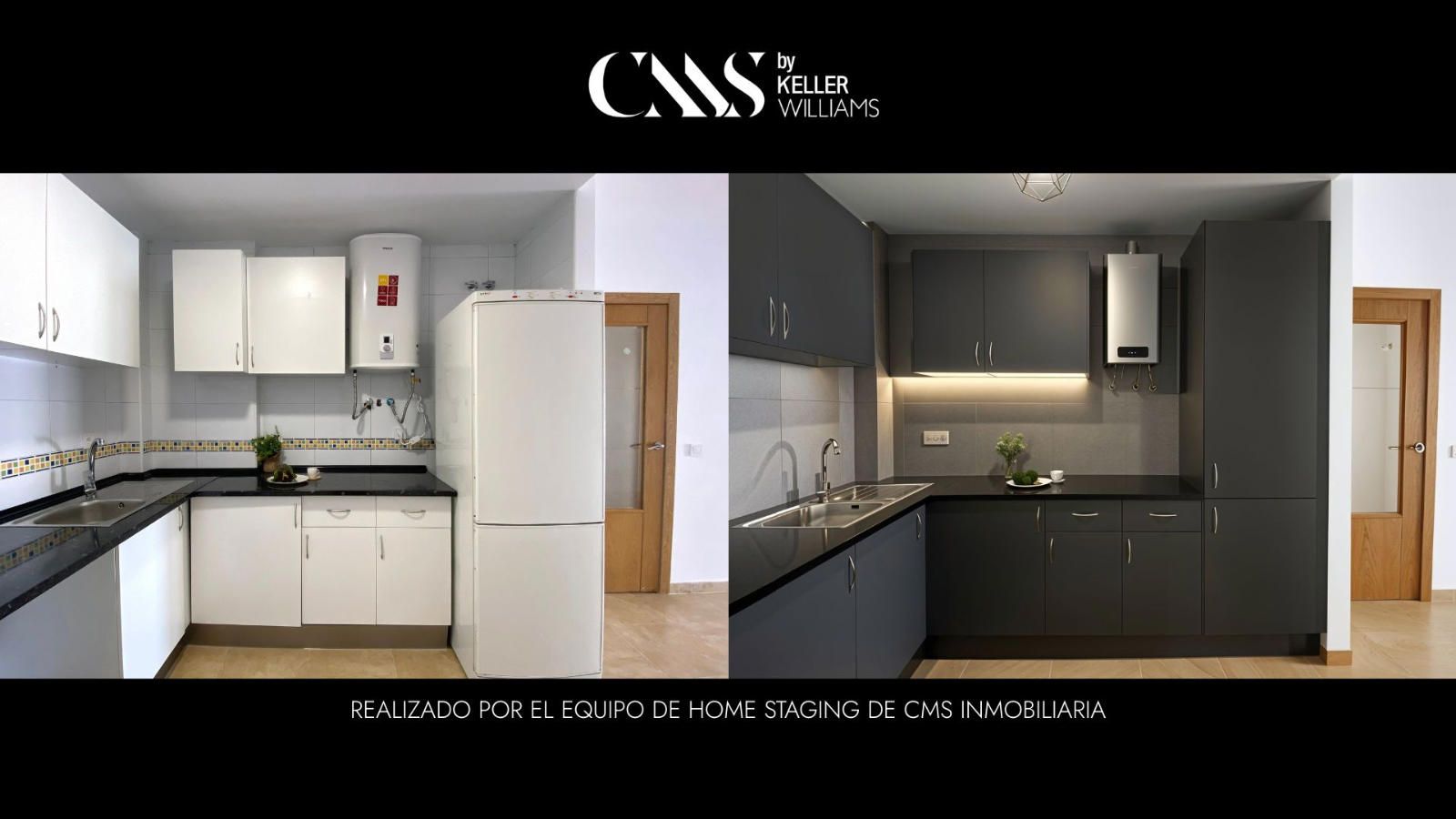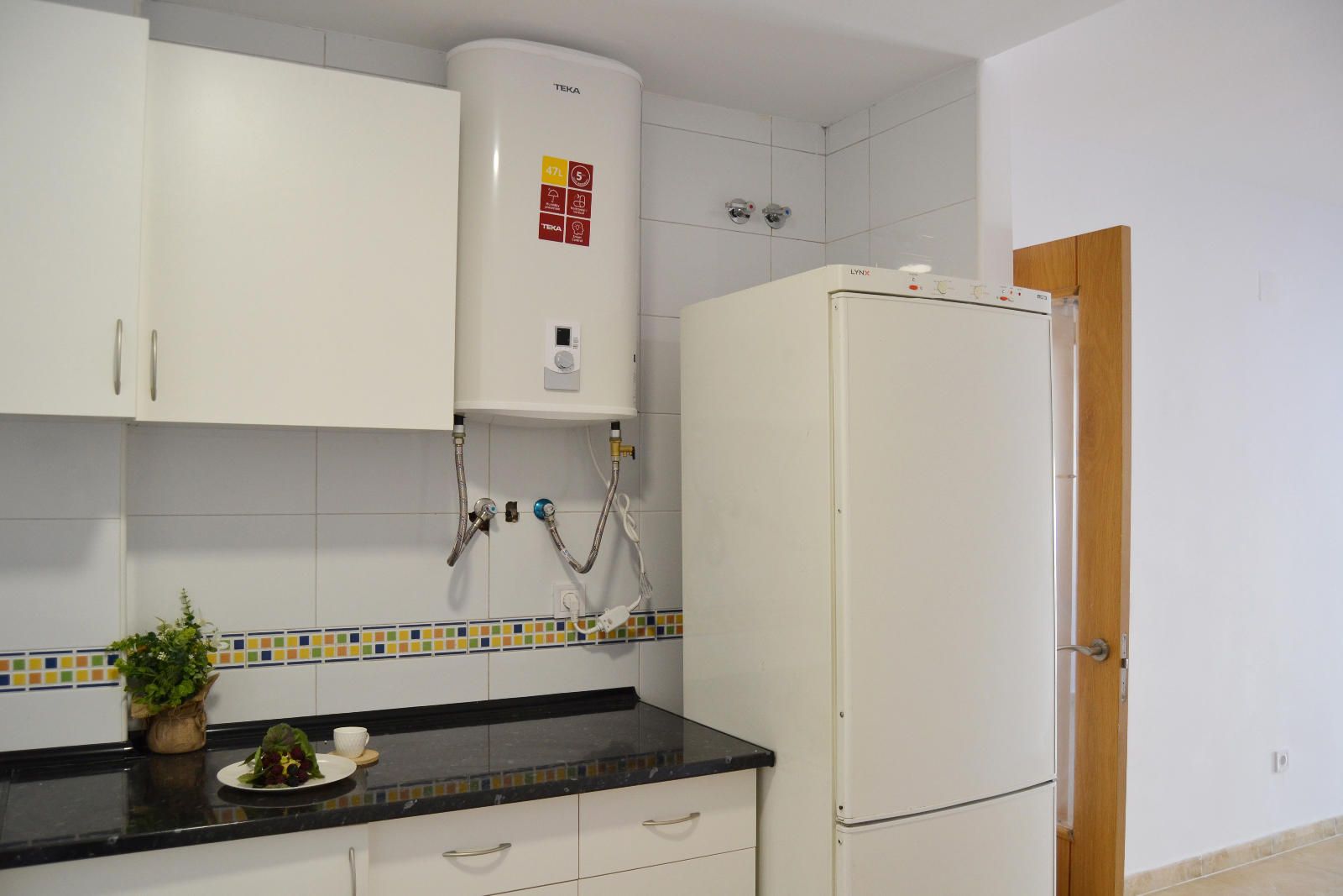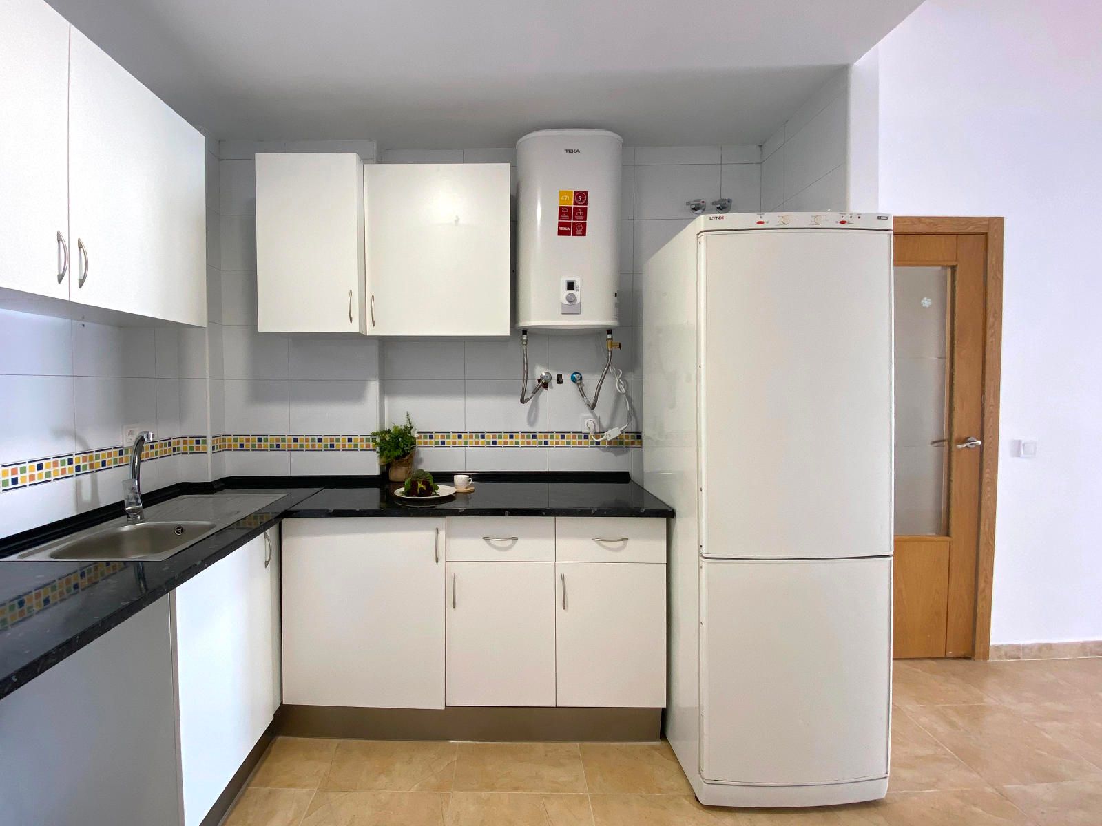La cocina, moderna y funcional, se integra perfectamente en el salón sin sacrificar su propia identidad. Equipada con muebles de almacenamiento en color blanco y una elegante encimera de granito negro, ofrece un contraste sofisticado y atemporal. Incluye una campana extractora y espacio para los electrodomésticos principales. Su diseño intuitivo facilita la preparación de comidas y el mantenimiento diario.