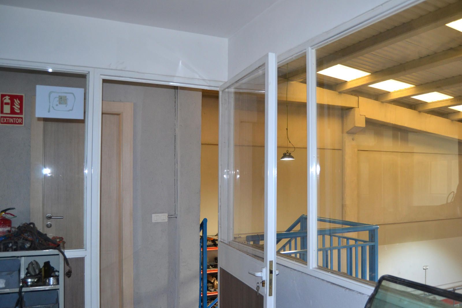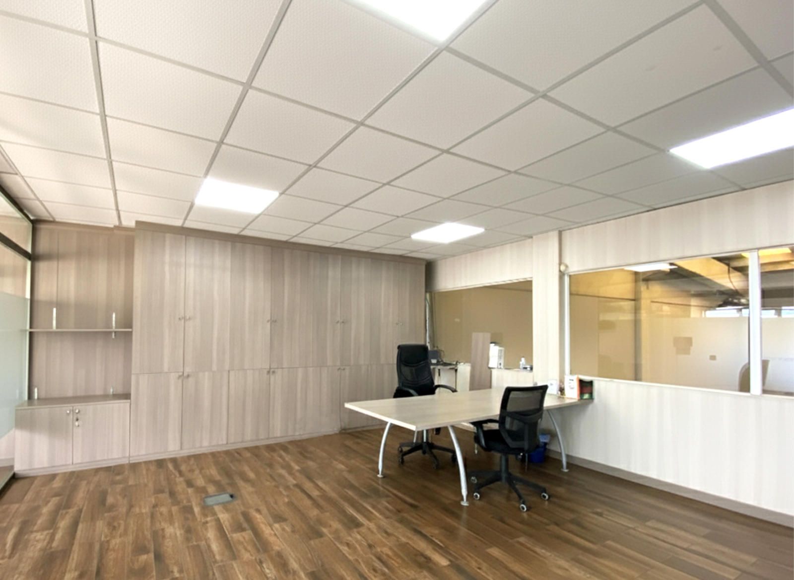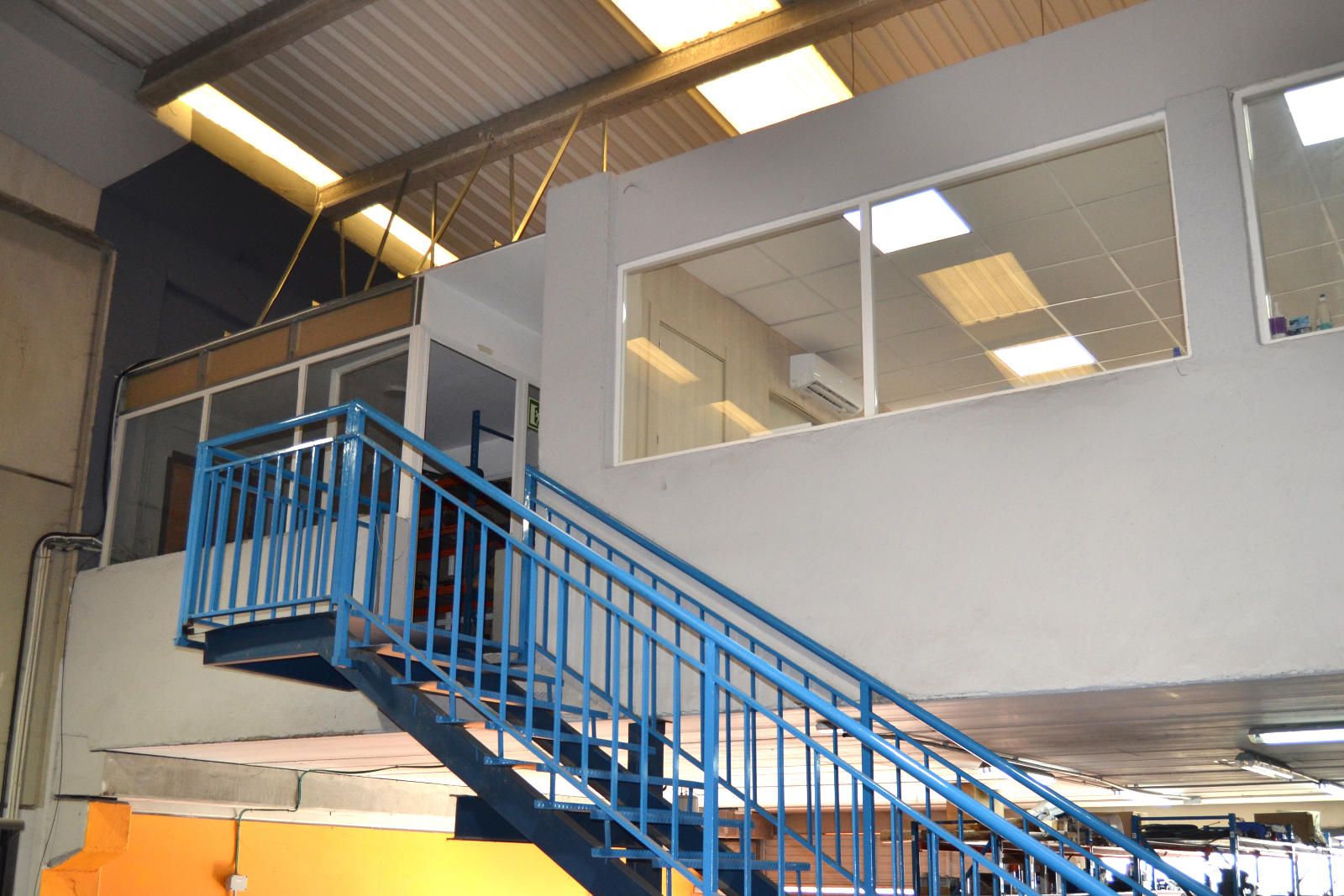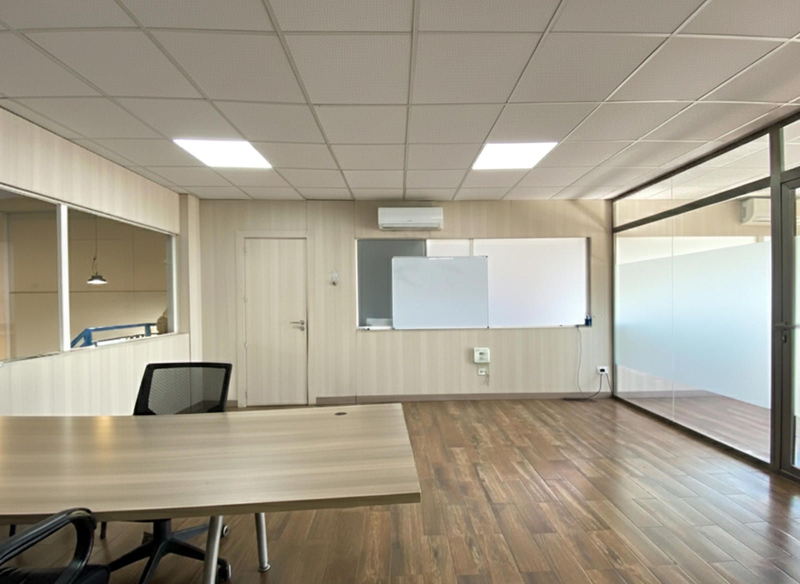 La segunda planta es el área de gestión por excelencia de esta propiedad, pensada para la parte administrativa y de oficinas. Aquí encontramos un total de cuatro salas, todas ellas diseñadas para ofrecer un entorno de trabajo productivo y confortable. Una de las salas ha sido acondicionada como una oficina moderna con divisiones de cristal y madera, lo que permite la entrada de luz natural y mantiene la sensación de amplitud. Cuenta con iluminación técnica y sistemas de climatización, asegurando un ambiente de trabajo óptimo. Otra de las salas destaca por su tamaño y luminosidad, gracias a sus amplios ventanales que ofrecen vistas despejadas del polígono. Este espacio, con suelo de tarima flotante, es ideal para una sala de juntas, un área de trabajo colaborativo o la oficina de dirección.
