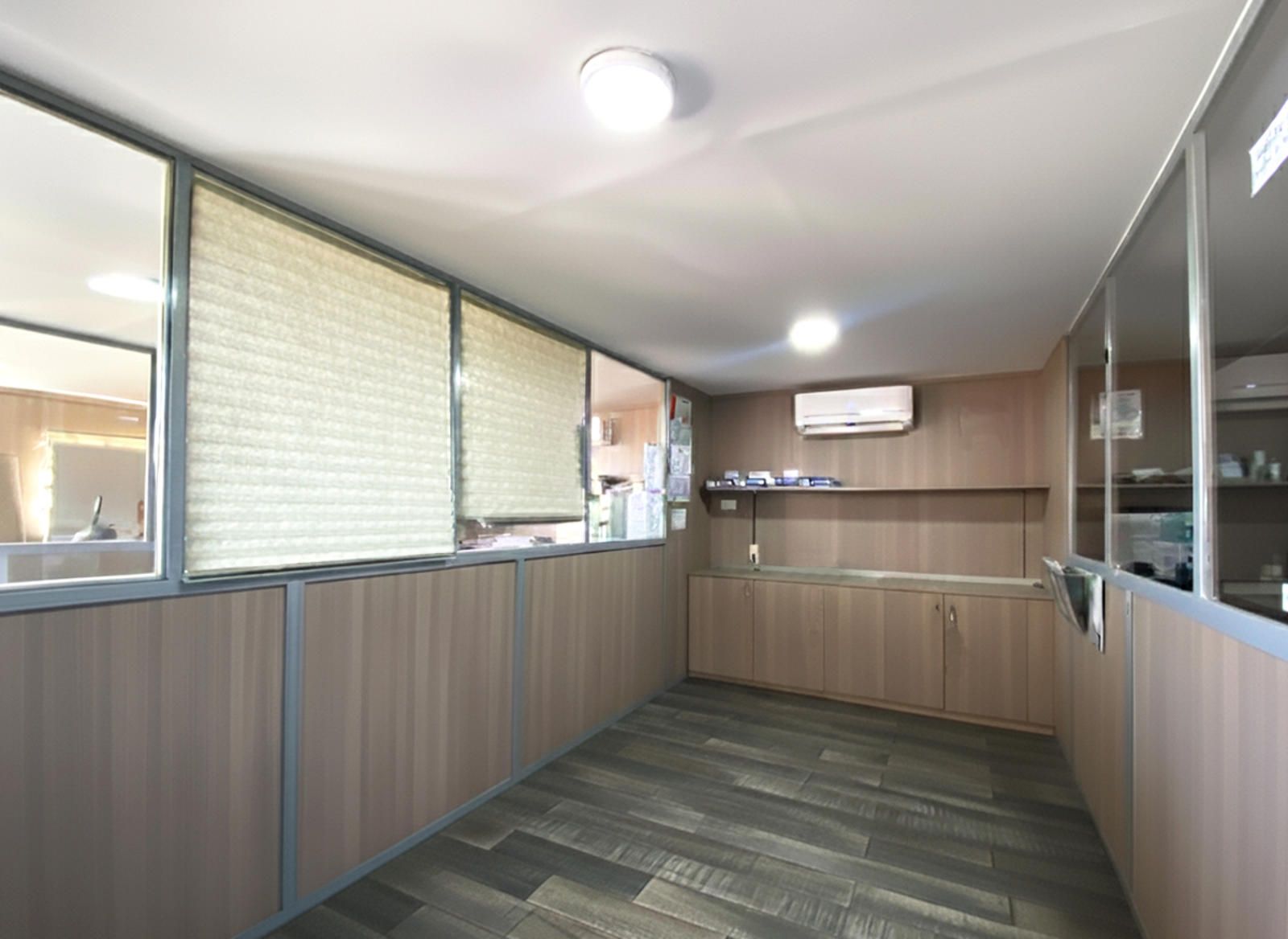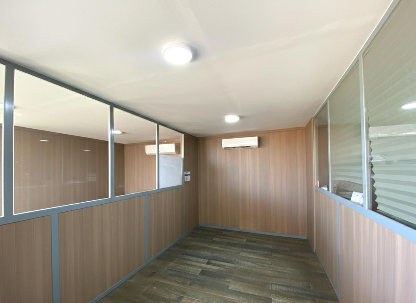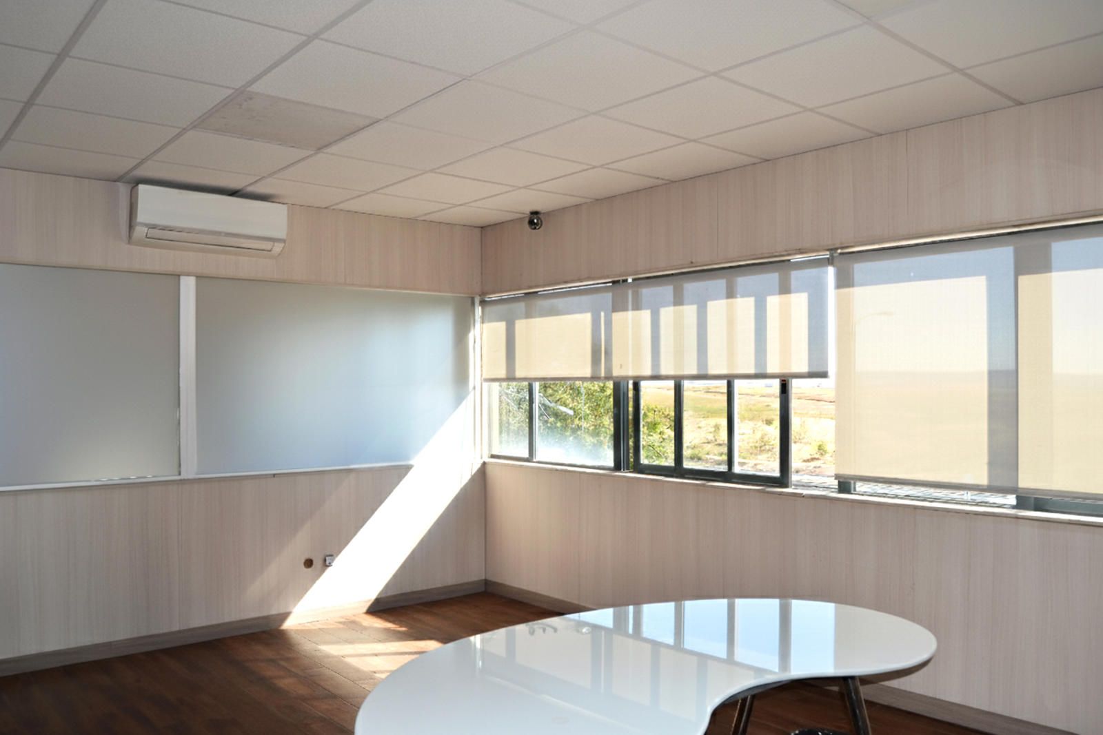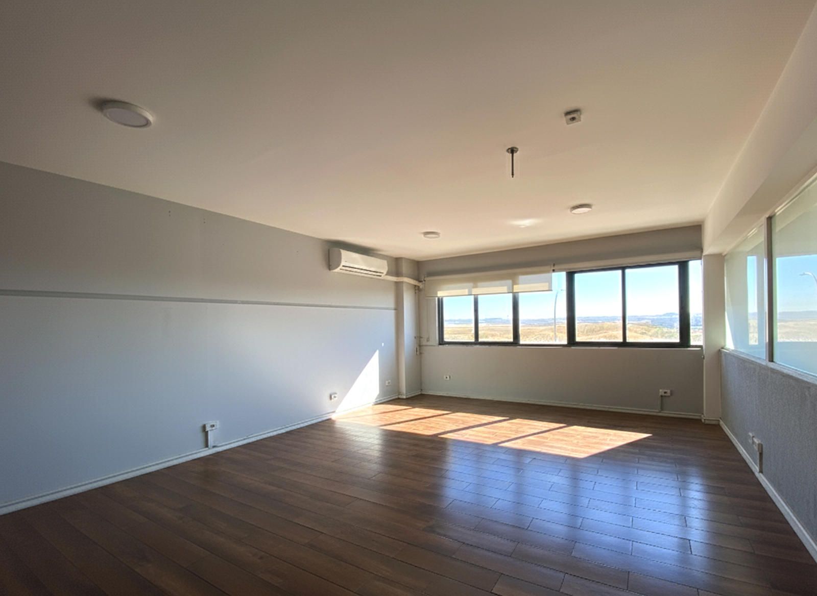 La segunda planta es el área de gestión por excelencia de esta propiedad, pensada para la parte administrativa y de oficinas. Aquí encontramos un total de cuatro salas, todas ellas diseñadas para ofrecer un entorno de trabajo productivo y confortable. Una de las salas ha sido acondicionada como una oficina moderna con divisiones de cristal y madera, lo que permite la entrada de luz natural y mantiene la sensación de amplitud. Cuenta con iluminación técnica y sistemas de climatización, asegurando un ambiente de trabajo óptimo. Otra de las salas destaca por su tamaño y luminosidad, gracias a sus amplios ventanales que ofrecen vistas despejadas del polígono. Este espacio, con suelo de tarima flotante, es ideal para una sala de juntas, un área de trabajo colaborativo o la oficina de dirección.