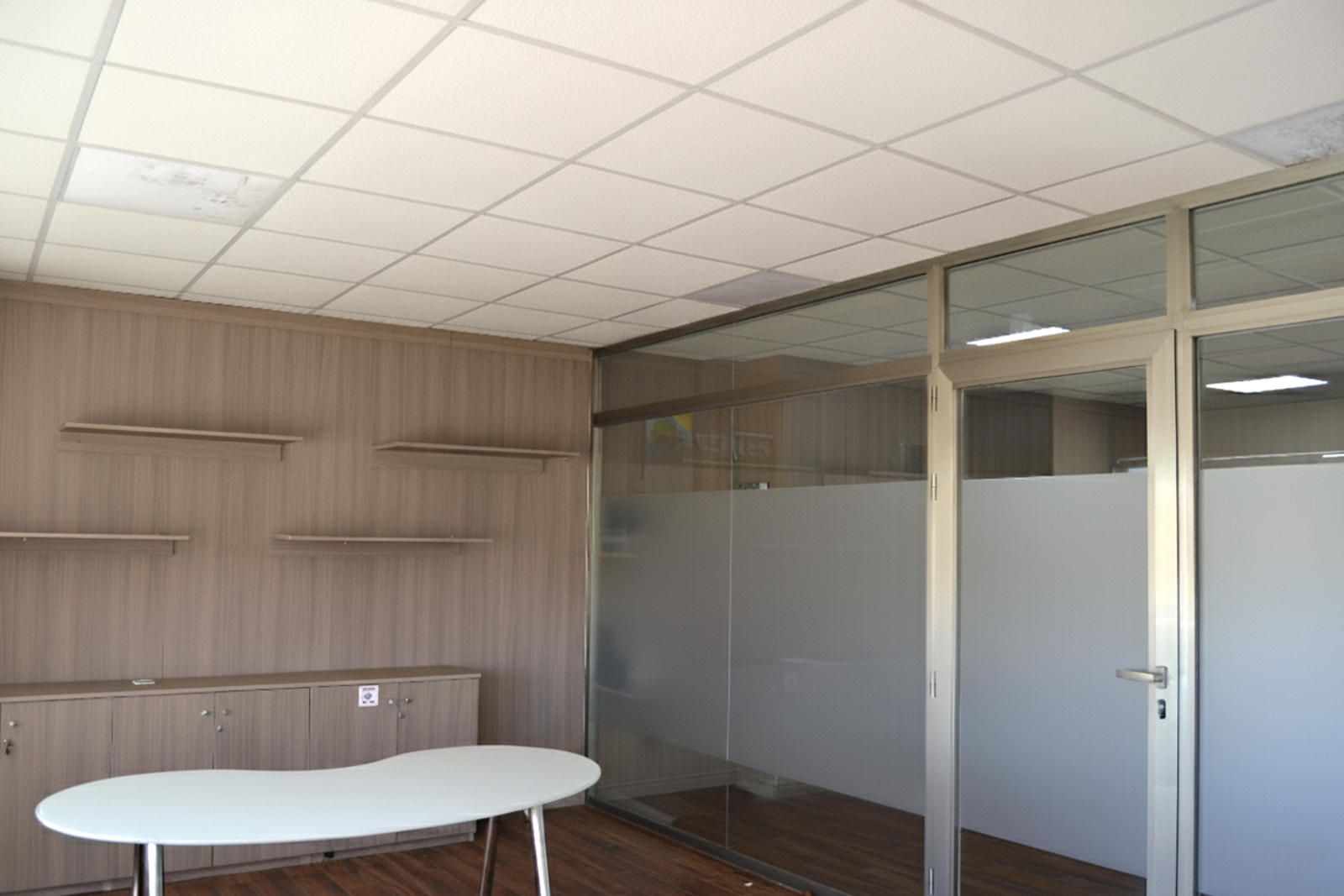 El resto de las oficinas de la planta baja tienen un diseño coherente y funcional. Una de ellas, con estanterías de madera, se presta perfectamente para un área de archivo o para una oficina que requiera almacenamiento adicional. La otra, está perfectamente equipada para albergar diferentes puestos de trabajo, lo que la hace ideal para un equipo de ventas o un departamento de contabilidad. Cada sala está equipada con techo técnico y la misma calidad de acabados, lo que permite una integración armoniosa de todos los espacios.